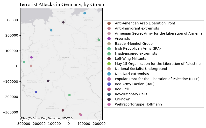 A choropleth for categorical variables assigns a different color to every potential value in the series based on certain colormaps (cmap). We don’t need to specify a scheme in this case, but just to the categorical column. Using last’s week GeoDataFrame, we can plot terrorist attacks in Germany, for example, by group.