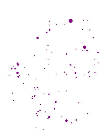 We can also convey the impact of the events through the markersize. This introduces the concept of cartogram (see below).