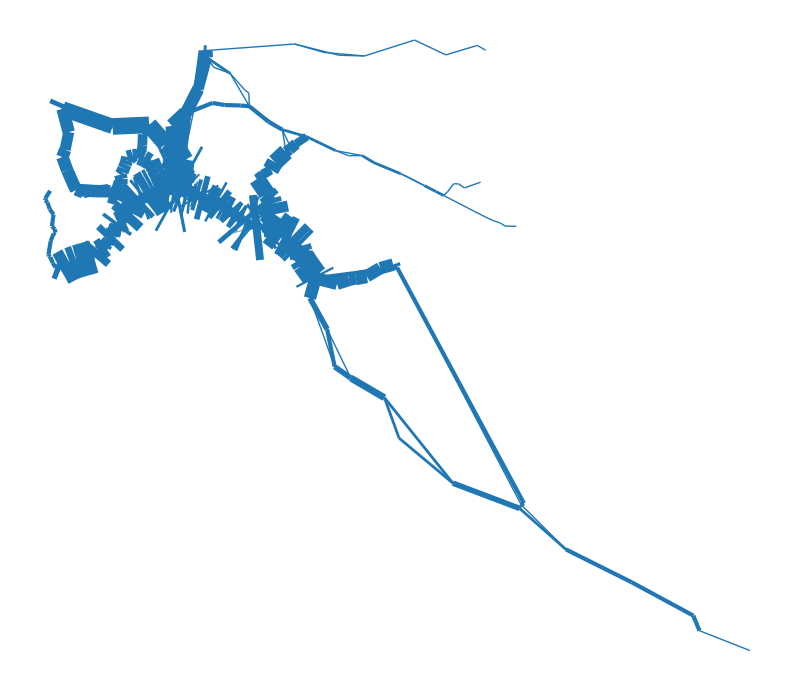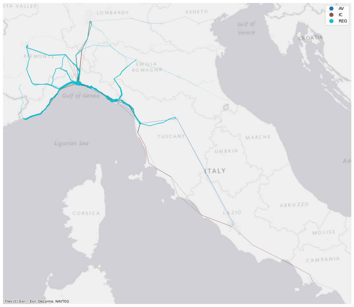 trains_freq = trains_freq[trains_freq['train_type'].isin(to_keep)]The usage of linewdith is a bit different from markersize for some reason. We have to pass an array of N values, where N is equal to the GeoDataFrame size. In other words, we have to pass the column we want to use to regulate the line width directly as a list/array. Specifying the column name is not enough.