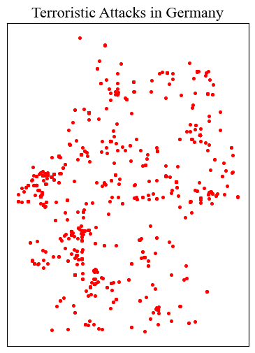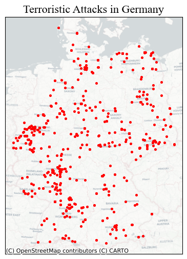 Load the data of terrorist attacks 1970-2020 and choose a country. Germany is used as a case study here but feel free to change the country. If you do so, also change the crs (see https://epsg.io).